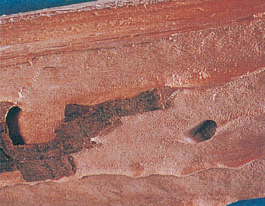 De ovale huller i veddet er indgangshuller til forpupningsgangene. Gangene er fulde af løst boremel. Det består af en blanding af lyse og mørke partikler.